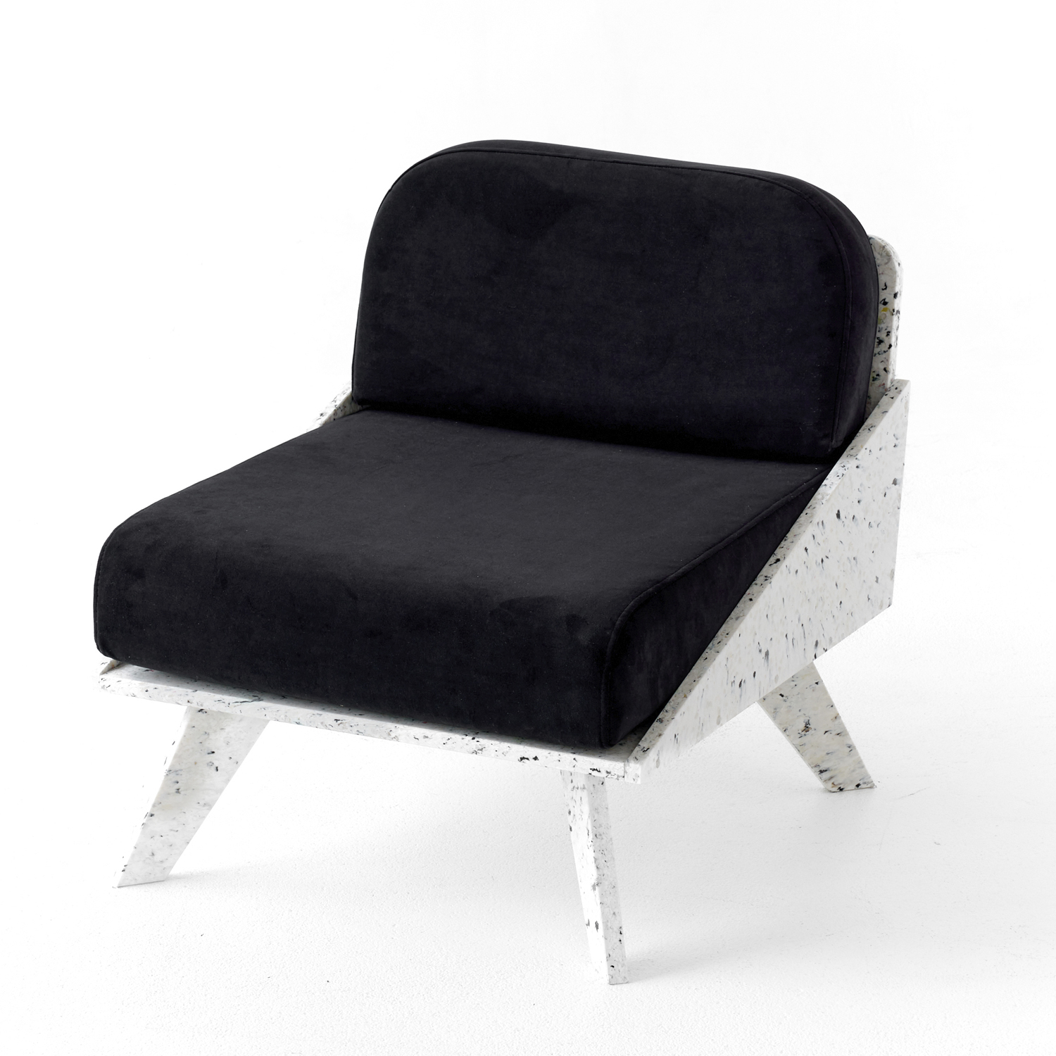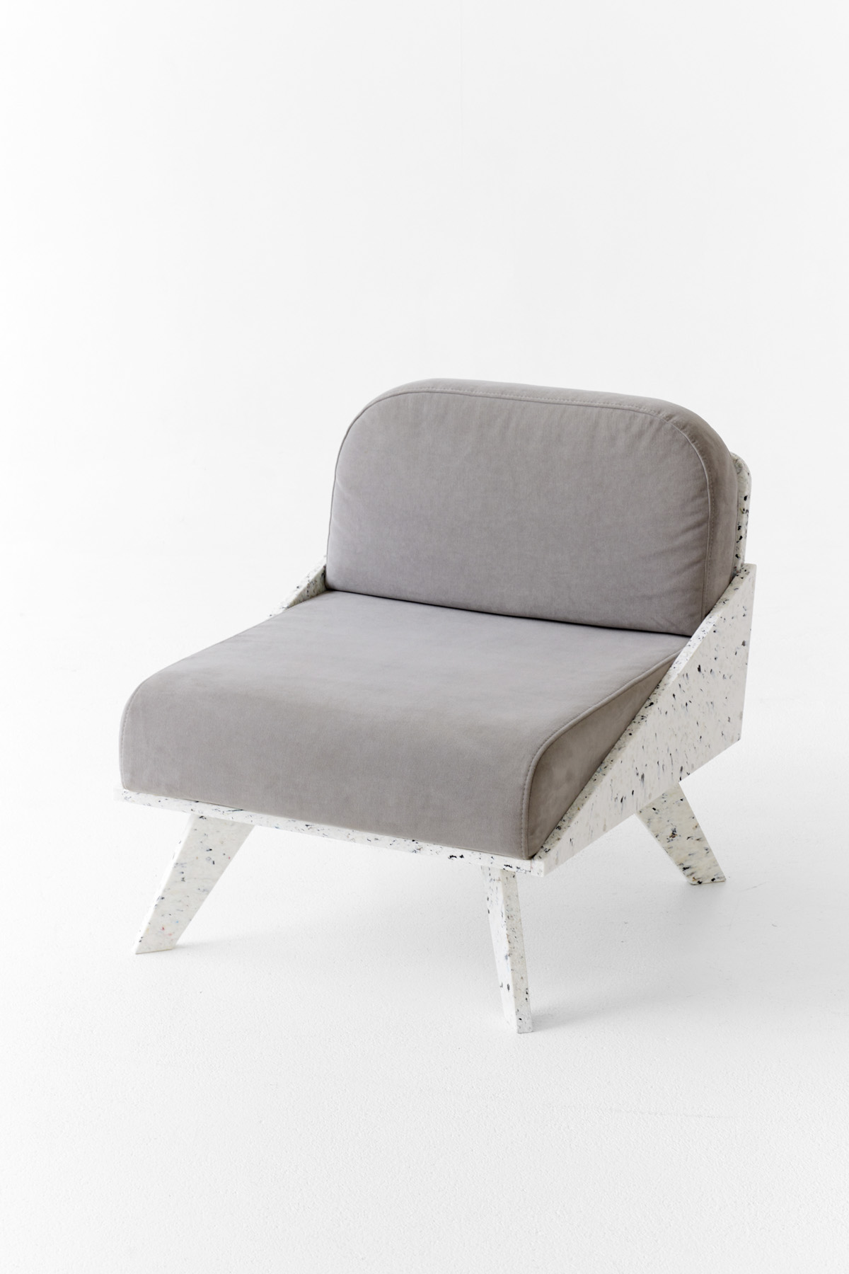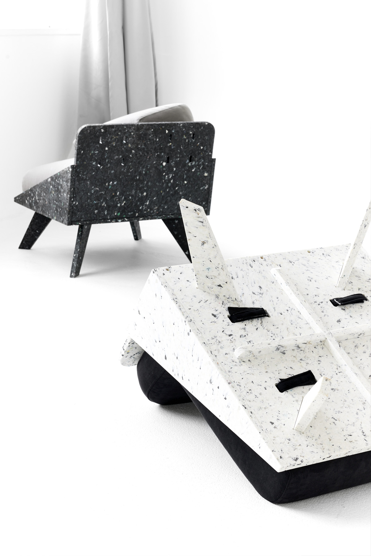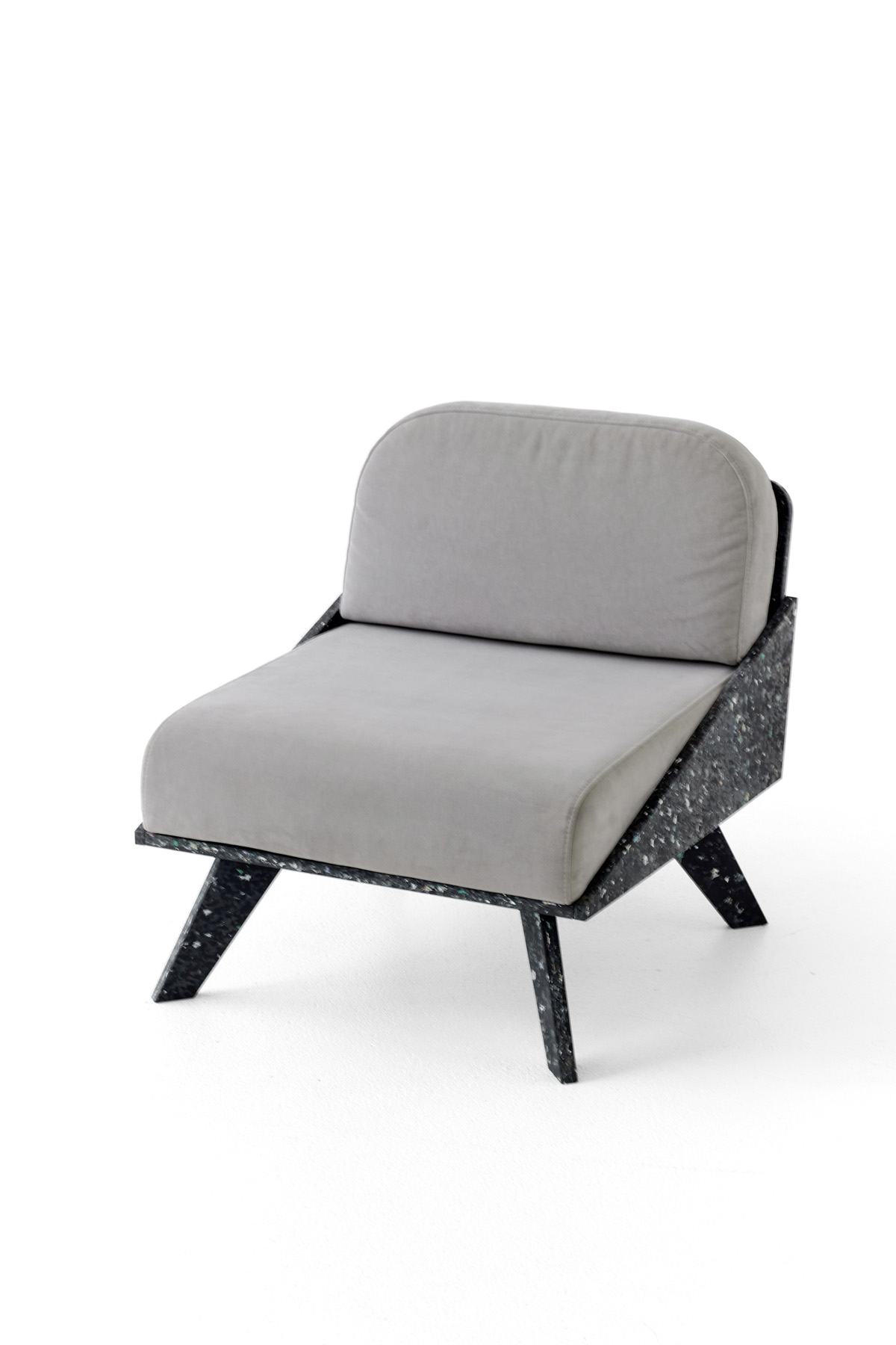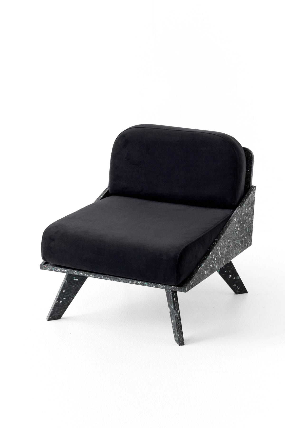 Переработанный пластик, поролон, ткань, эмаль, лак.